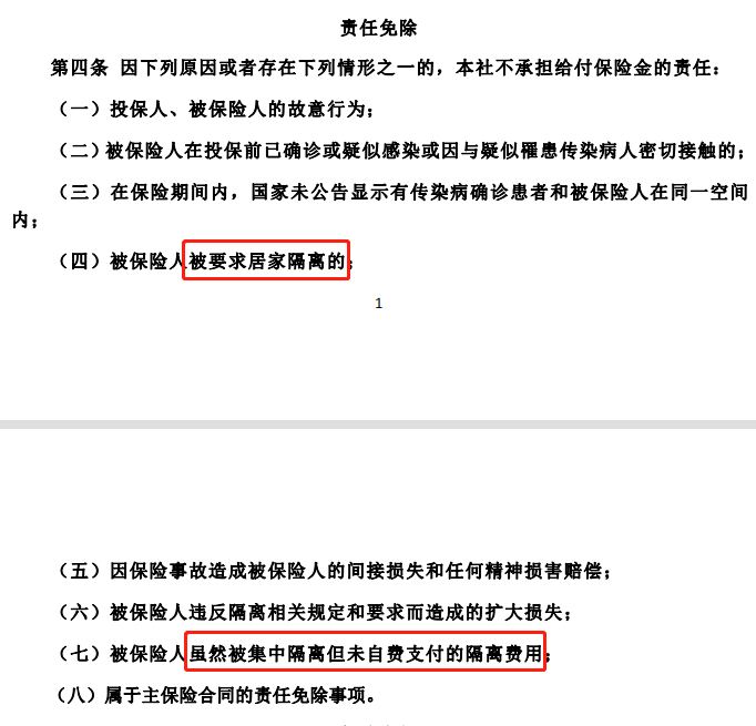 消费者张女士购买了众安保险推出的“新冠隔离疫情津贴险”。该保险在页面上标明,对因交通工具与新冠患者接触而被集中隔离的可获得1000元/天的高额补贴。但她在隔离之后申请理赔时发现,保险条款将“免费隔离”列为免赔责任。该保险公司客服也回复表示,保险合同第四部分第七条规定7种情况不赔,其中包括:被保险人被要求居家隔离不赔;被保险人虽然集中隔离但未自费支付的隔离费用不赔。