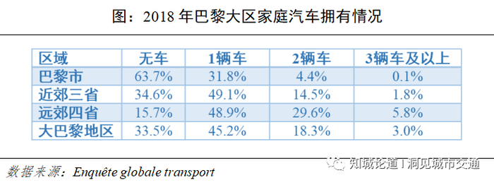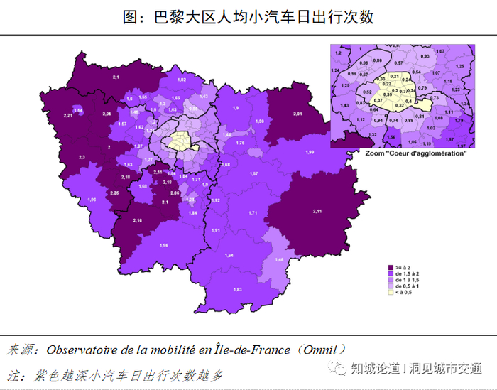 从小汽车使用上来看,巴黎市的小汽车出行强度要远低于外围地区!