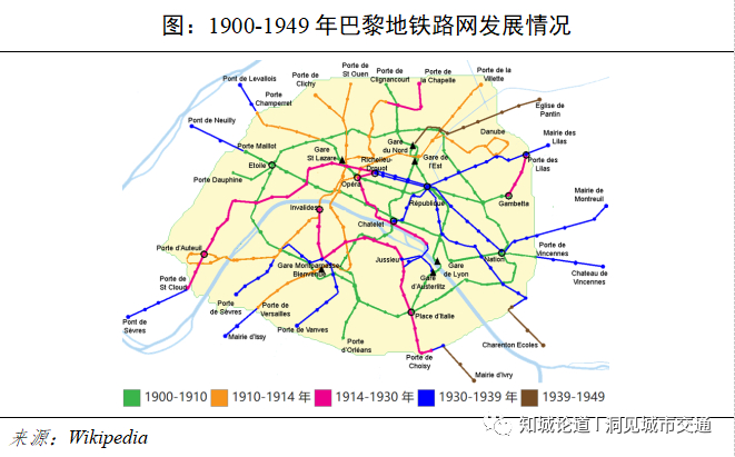 1930年前,地铁建设集中在巴黎市以内。到1913年,巴黎地铁的线路已经达到了10条,年客运量从1901年的5500万人次,增长到了1913年的4.67亿人次[5]。从1930年开始地铁线路逐渐扩展到巴黎近郊。