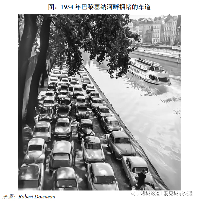 与此同时,二战后小汽车保有量激增,城市机动化出行呈现井喷之势。20世纪50年代末,汽车的过度发展逐渐使城市交通瘫痪,市中心区的交通拥堵甚至让生性闲散的巴黎人都感到心烦。