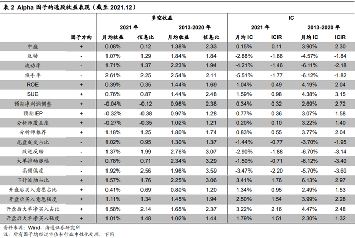 2021年,大盘龙头股发生回撤,中盘股表现强势,使得中盘因子失效,月均IC仅为0.15%,月均多空收益0.08%,显著低于以往平均水平。