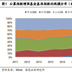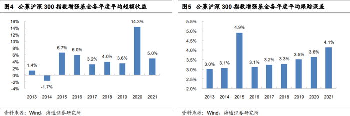 截至2021年底,市场现存161只公募指数增强基金,相较于去年增加34只;规模总计1777亿元,相较于去年增长47.5%。除跟踪中证500指数的基金以外,跟踪沪深300指数的基金共47只,规模总计509亿元,同比增长19%;跟踪上证50指数的基金共4只,规模总计244亿元,同比下降13%。