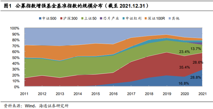 公募指数增强基金以宽基为主,2018年以来,规模占比逾7成的产品均以沪深300、中证500和上证50指数作为基准。分指数来看,2020年及以前,宽基指数增强基金以沪深300增强为主,上证50增强为辅,再次是中证500增强。2021年,受益于基准指数优异的表现以及可观的超额收益,中证500指数增强基金的数量和规模均显著增长。整个2021年,市场新增9只中证500指数增强基金,存续产品共计47只;规模增长1.5倍,至512亿元。中证500已成为指数增强产品中,跟踪规模最大的基准指数。