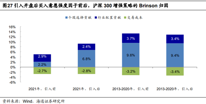 价量因子在沪深300指数成分股内的选股效果普遍弱于全市场,开盘后买入意愿强度因子也不例外。引入该因子后,策略全区间收益风险特征无明显变化;但2021年收益改善明显,超额收益由2.3%提升至6.5%(图25),个股选择贡献由2.2%提升至6.8%(图27)。