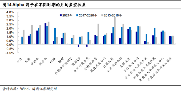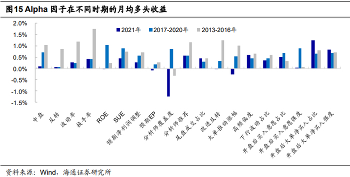 基本面因子的表现相较于前期大幅下滑,特别是盈利因子,月均多头收益降至0.02%,与2017-2020年1.05%的多头收益相差甚远,甚至低于2013-2016年的平均水平(0.24%)。SUE因子的月均多空收益也下降了近一半,由2017-2020年的1.42%降至2021年的0.76%。