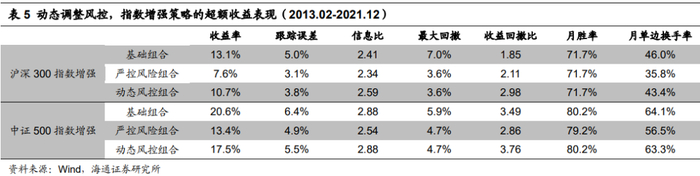 为便于表述,后文中,我们将“行业偏离3%、个股偏离1%、因子敞口0.6”的指数增强组合称为“基础组合”,“行业中性、个股偏离0.5%、因子敞口0.3”的组合称为“严控风险组合”。