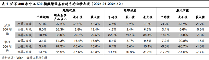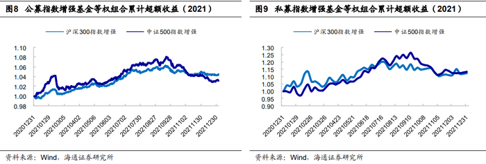 2021 年,中证500指数增强基金备受青睐,无论是公募还是私募产品,规模和数量均出现明显增长。业绩表现上,沪深300和中证500指数增强基金9月以前超额收益稳定向上;而进入9月下旬之后,出现持续回撤。全年来看,公募沪深300指数增强基金的平均超额收益处于历年中等位置,同时跟踪误差较大;中证500指数增强基金的平均超额收益处于偏低水平,跟踪误差同样较大。