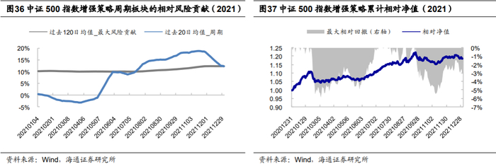 具体到因子,组合的成长风格暴露给策略带来了较为明显的负向超额。无论是沪深300还是中证500指数增强策略,在高估值因子上的暴露均达到了约束的上限(0.2)。2021年,估值风格波动剧烈,全年呈较为明显的价值风格,这使得具有成长暴露的指数增强策略一方面波动较大、回撤明显,另一方面也削弱了策略的超额收益。