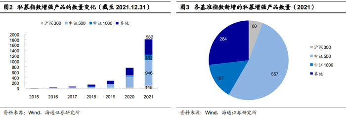 私募指数增强产品也呈类似特征。2021年,中证500指数增强产品更受青睐。截至12月底,2021年新发私募指数增强产品共1058只。其中,中证500指数增强产品新增557只,占据新增产品的半壁江山。