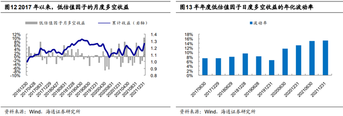 自2020年下半年以来,估值风格一直呈剧烈波动状态,因子日度多空收益的波动率居高不下,高于2017年以来所有的半年度(图13)。2021年,大部分月份,市场仍为成长风格,但2-3、7-8、以及12月份,成长风格大幅回撤,低估值股票组合相对高估值股票组合的月超额达5%以上,出现显著的价值修复行情。全年来看,市场呈价值风格,低估值股票组合的收益率高于高估值股票组合。