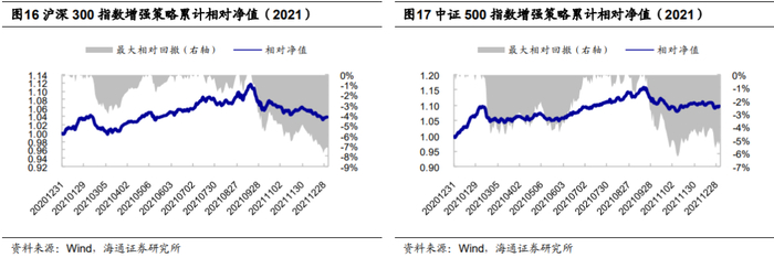 我们基于常用的风格、技术、基本面、预期、高频因子构建的海通金工沪深300指数和中证500指数增强策略,2021年超额收益水平偏低,波动较大,回撤达到2013年以来的最高水平。归因模型显示,2021年,指数增强策略个股选择贡献大幅降低,拖累策略超额收益。