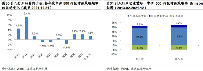 引入新的Alpha源,是提升指数增强策略因子贡献最直接的方式。近年来,A 股内外资机构投资者占比持续上升。相较于散户,机构投资者的投资行为更加理性,与投资者过度反应有关的低频反转类因子近几年表现欠佳。我们认为,在这种机构话语权逐渐增大的环境下,高频动量类因子值得关注。例如,在收益预测模型中加入海通量化团队开发的“开盘后买入意愿强度”因子,2021年可明显提升指数增强策略的业绩表现。