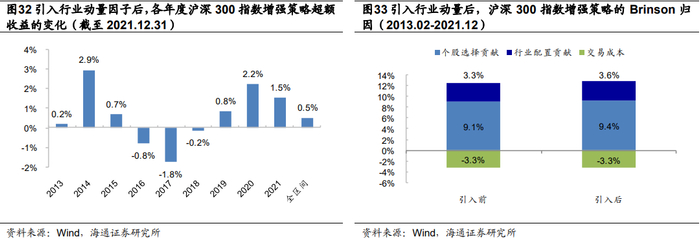 需要注意的是,2016-2017年的大部分月份,引入动量因子并不能改善行业轮动因子的多空收益,因此对两个指数增强策略都造成了年化1%左右的收益损失。由此可见,引入行业轮动模型虽然潜在收益可观,长期来看能提升策略业绩表现,但短期也存在一定的行业错配风险。