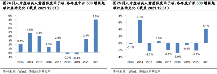 综上所述,引入买入意愿强度因子可显著改善指数增强策略2021年度的业绩表现。从历史业绩来看,该因子对中证500指数增强策略的收益提升更为稳定,绝大部分年份均可明显增厚策略收益;而对沪深300指数增强策略的业绩表现则无明显影响。我们认为,随着A股投资者机构化的逐步演进,反转效应,特别是反转类因子的多头效应,难以重现2013-2016年的高收益,而像开盘后买入意愿强度这种高频动量类因子值得关注。