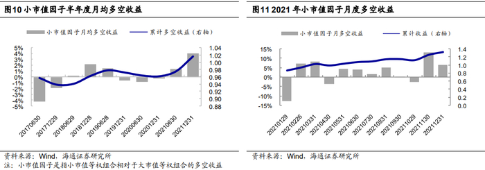 基于市值将全市场股票等分为10组,考察市值最小一组股票等权组合相对于市值最大一组股票等权组合,每半年度的月均多空收益差,结果如左下图所示。2021年,市值风格发生明显切换,由2019年下半年以来的大盘风格切换至小盘风格。进一步,从右下图可见,除1、4、10月份外,大盘股在其他月份都显著跑输小盘股。