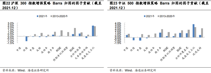 与历史(2013-2020)相比,2021年,指数增强策略的个股选择贡献大幅降低:沪深300指数增强策略下降7.4%,中证500指数增强策略下降4.8%。同时,行业配置贡献也出现了小幅降低。