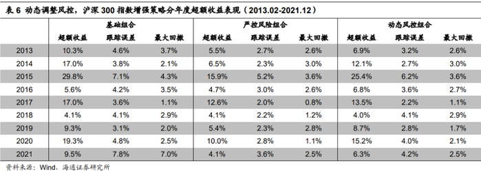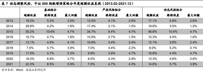 与“基础组合”相比,“动态风控组合”的超额收益虽有所下降,但跟踪误差和最大回撤得到明显控制,相应的信息比和收益回撤比都有所改善(表5)。分年度来看,2013-2021年期间,绝大部分年份的跟踪误差和最大回撤都有所降低(表6-7)。而与始终严控风险的组合相比,“动态风控组合”的风险指标仅略微增加,但收益提升明显。