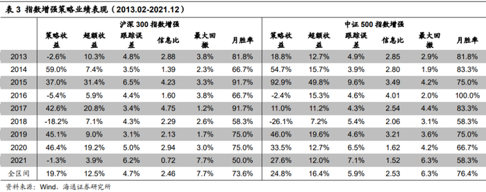 综上所述,2021 年,中证500指数增强基金备受青睐,无论是公募还是私募产品,规模和数量均出现明显增长。业绩表现上,沪深300和中证500指数增强基金9月以前超额收益稳定向上;而进入9月下旬之后,出现持续回撤。全年来看,公募沪深300指数增强基金的平均超额收益处于历年中等位置,同时跟踪误差较大;中证500指数增强基金的平均超额收益处于偏低水平,跟踪误差同样较大。