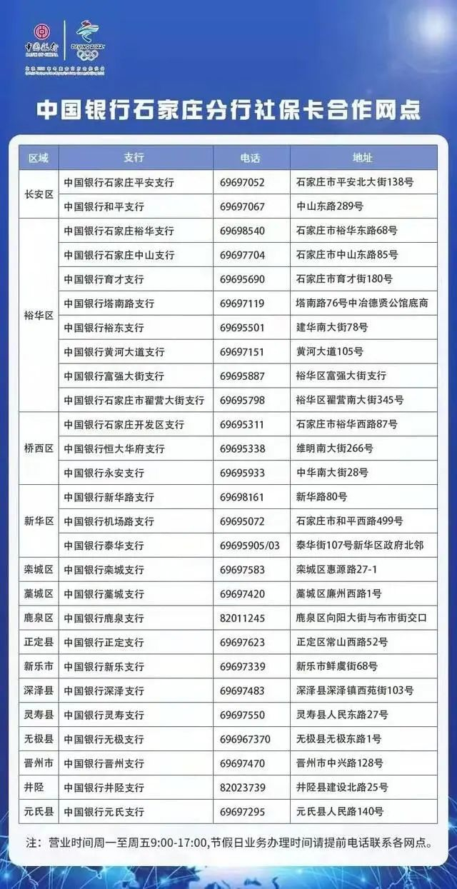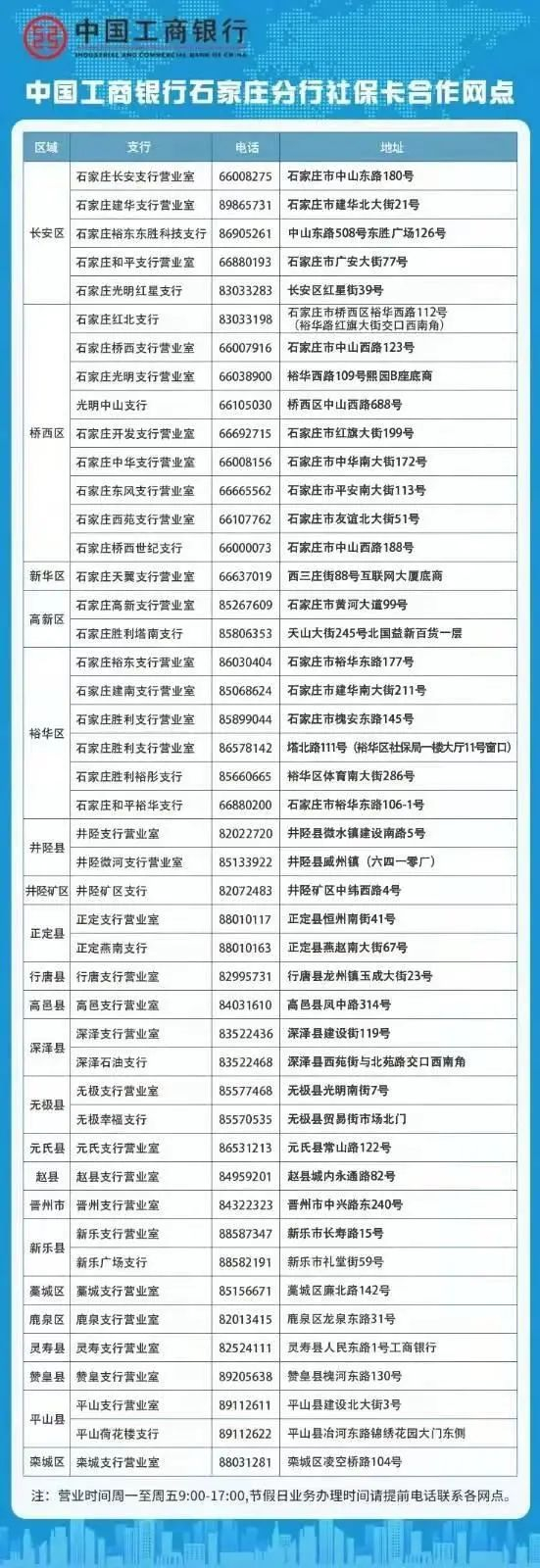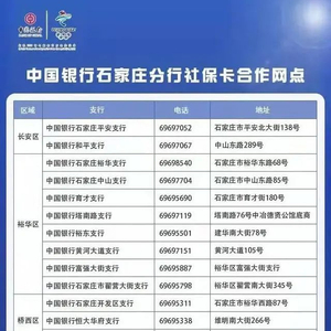 石家庄市补办第三代社保卡合作银行网点联系方式如下: