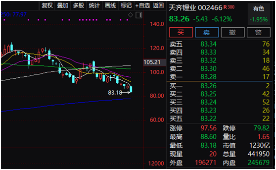 天齐锂业盘中暴跌超过6%,赣锋锂业盘中暴跌超过5%。