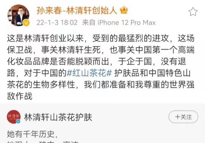 “这是林清轩创业以来,受到的最猛烈的进攻,这场保卫战,事关林清轩生死,也事关中国第一个高端化妆品品牌是否能脱颖而出,于国于企,没有退路,对于中国的红山茶花护肤品和中国特色山茶花的生物多样性,我们都准备和我尊重的世界强敌作战。”林清轩创始人孙来春在社交媒体如此说道。