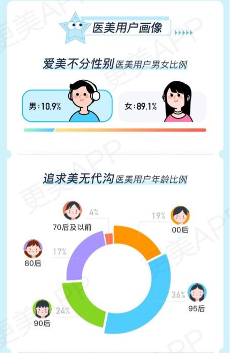 在消费者年龄方面,男女比例约为1比9,女性消费群体依旧占据主流,但男性消费群体也不可忽视。而从医美消费群体年龄结构上看,主体趋于年轻化,虽然95后仍是医美行业主力军,但是00后占比达到19%。可见00后已经逐渐具备医美消费能力,将成为医美行业未来的新兴消费群体。