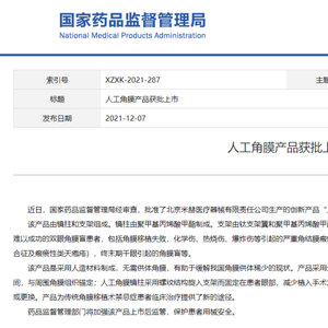由北京米赫医疗器械有限责任公司设计、研发、生产的人工角膜于日前正式获得国家药品监督管理局颁发的第三类《医疗器械注册证》。根据国家药监局官网的公开信息显示,米赫人工角膜采用人造材料制成,无需供体角膜,有助于缓解我国角膜供体稀少的现状,并为高危角膜移植患者的临床治疗提供了新的途径。