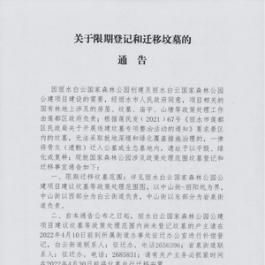 因丽水白云国家森林公园创建及丽水白云国家森林公园公建项目建设的需要,经丽水市人民政府同意,项目相关的国有林地上涉及的房屋、坟墓、庙宇、山塘等政策处理工作由莲都区政府负责;根据莲民发﹝2021﹞67号《丽水市莲都区民政局关于开展违建坟墓专项整治活动的通知》要求景区内的坟墓,无法采取就地深埋和绿化覆盖措施治理的,一律将骨灰(遗骸)迁入公墓或生态墓地内,遗址予以平毁、绿化或复耕;现就国家森林公园涉及政策处理范围坟墓登记和迁移事宜通告如下: