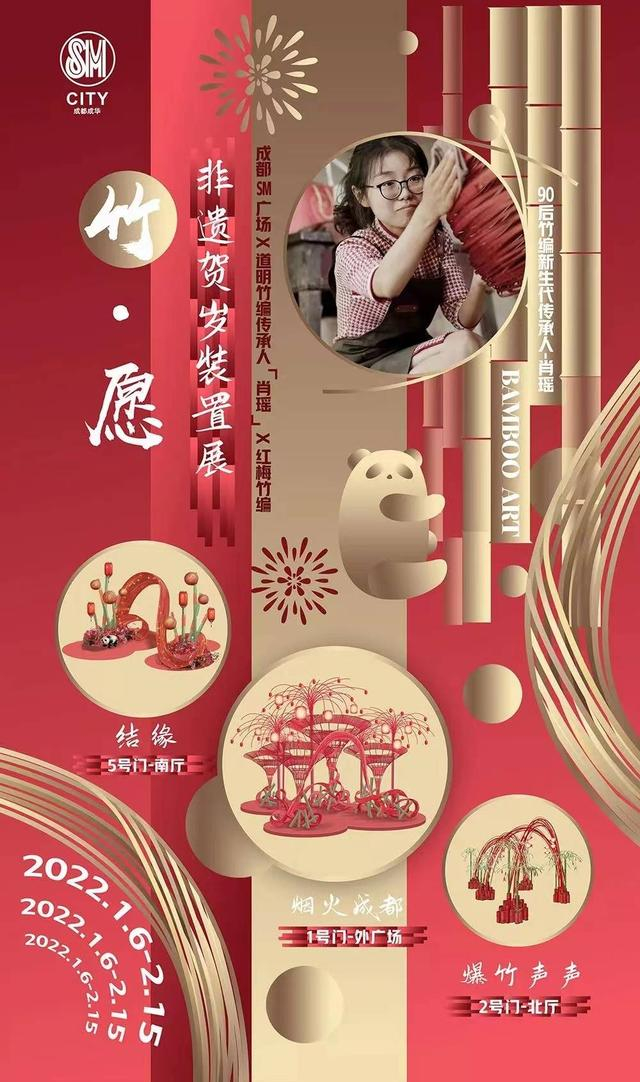成都SM广场从即日起至2月15日,联合道明竹编传承人肖瑶以及红梅竹编,带来一场超级震撼的竹艺展,将新年红+竹艺文化的创意结合,打造出虎年必打卡TOP系列。道明竹编是四川省崇州市道明镇的传统特产,距今已有2000多年的编织历史,以精巧工艺、别致造型闻名,于2014年成功入选第四批国家级非物质文化遗产代表性项目名录。90后竹编新生代传承人——肖瑶,用年轻视角赋予非遗竹编独特美学,匠心创作新派竹编雕塑。编织竹篾以天然线条弧度,凸显竹之韧,在整个安静的作品里储存流动的趋势,传统中国红的色彩运用,彰显冬日里万物沉静外表下浓浓生机!