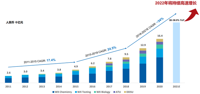 ✱ 药明康德始终贯彻执行「跟随分子」的战略,整合后的化学业务(WuXi Chemistry)板块,持续建设「一体化,端到端」CRDMO(合同研究、开发及生产组织)业务,订单需求旺盛,推动2021年全年销售收入加速增长。