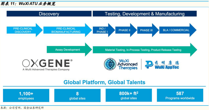 WuXi ATU 作为药明康德细胞与基 因疗法业务平台,开创了独特的 CTDMO (合同测试、开发、生产外包服务) 商业模式,从而可以更好地应对当前 CGT 领域测试、开发和放行复杂度和 困难度大的问题,有效解决放大生产的成本问题。