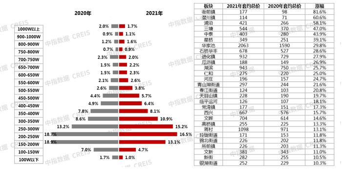 从套总价板块分布来看,郊区板块套总价增长显著,购房门槛提升,核心区板块受限于严格的限价,套总价增长有限。