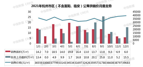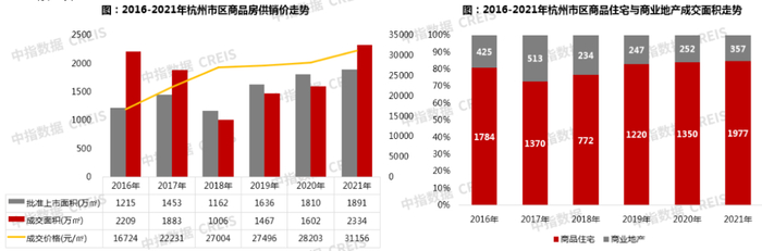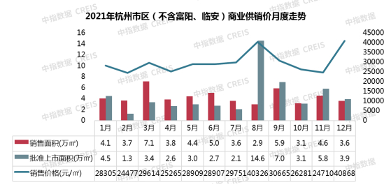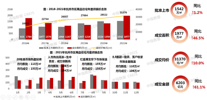 2021年杭州商品房成交量价齐涨,商品房累计成交2334万㎡,同比增长45.7%,成交均价31156元/㎡,同比上涨10.5%,大量高价盘入市是主要原因。