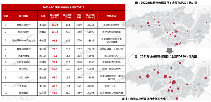 2021年,是红盘大量入市的一年,热销楼盘门槛值大幅提升,2021年杭州销售金额TOP10项目门槛值为61.2亿元,2020年仅37.3亿元;TOP20门槛值由2020年的29.8亿元上涨至47.0亿元;仔细分析热销原因:现房、倒挂红利盘逐渐退出市场,热销楼盘多规划/改善驱动,亚运村、未来社区、TOD等概念加持楼盘备受购房者青睐。未来买房投资属性减弱,购房者将更关注区域潜力与居住价值。