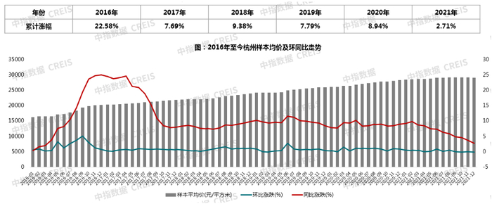 2021年,杭州新房样本均价累计涨幅2.71%,较去年收窄6.23个百分点,创近五年最低水平,且从历月表现来看,涨幅年内呈现持续收窄趋势。