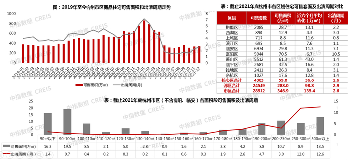 短期来看,截止2021年底,杭州市区住宅可售面积仅346.9万方,按照近6个月平均去化速度计算,市区出清周期仅2.6个月,处在低位,房源供应不足。分区域来看,除富阳去化周期10.5个月、临安去化周期7.1个月外,其余各区域出清周期均在4个月以内。
