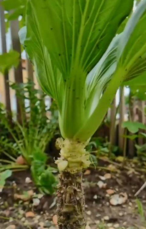 视频中,男子正在一片片掰着上海青的叶子,而底下的杆竟然长成了“树桩”的模样。