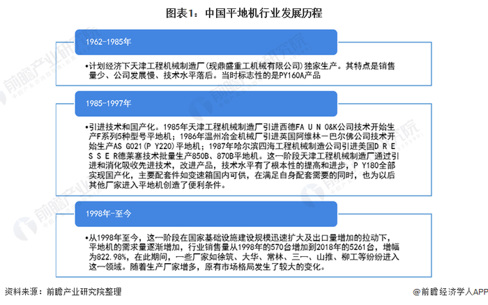 自行式平地机(简称平地机)是工程机械的重要机种,作为道路施工、场地平整的专业机械,在国内外基础工程施工中发挥着不可替代的作用。经过几十年的发展,中国平地机已经从无到有、从少到多,产品上不断实现技术进步,逐渐成长为工程机械领域的重要行业。从发展历程看,国产平地机自1962年诞生以来,50年来其产品和行业发生了巨大的变化,回顾其发展历程大体可以划分3个阶段: