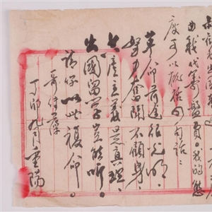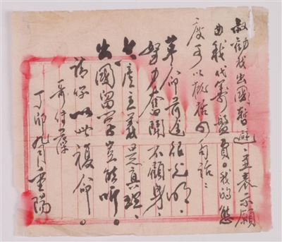 大革命失败后,白色恐怖笼罩洪湖,熊传藻的叔父出于对其安全的考虑,曾托人捎信给熊传藻,劝其脱离共产党,并愿意出资帮他出国留学避难。熊传藻为了表达自己坚定的革命信念,便于1927年10月4日给堂弟熊栋臣写了一封家书,谢绝了叔父的好意,表达了革命到底的决心。信中写道:“叔劝我出国暂避,并表示愿为我代筹盘费。我的态度可以概括四句话:革命前途很光明,努力奋斗不顾身。共产主义是真理,出国留学岂能听。请你以此复命。哥传藻,丁卯九月重阳。”信纸为毛边纸上下段竖红格老式账页,长22.5厘米,宽20厘米,横式长方形,竖格15行。文字内容为行书10行,每行3-12字不等,连标点共79字。信纸上套印之红竖格已漫漶褪色,右上角和左下角均有少许破损。从信残留的文字内容分析,应该不是完整版,但前面有多少页,尚无法判断。这封信一直由熊栋臣保存,可惜因年代久远,仅剩下一页。新中国成立后,这页烈士家信被洪湖革命历史博物馆征集收藏,1994年被评定为国家一级革命文物。