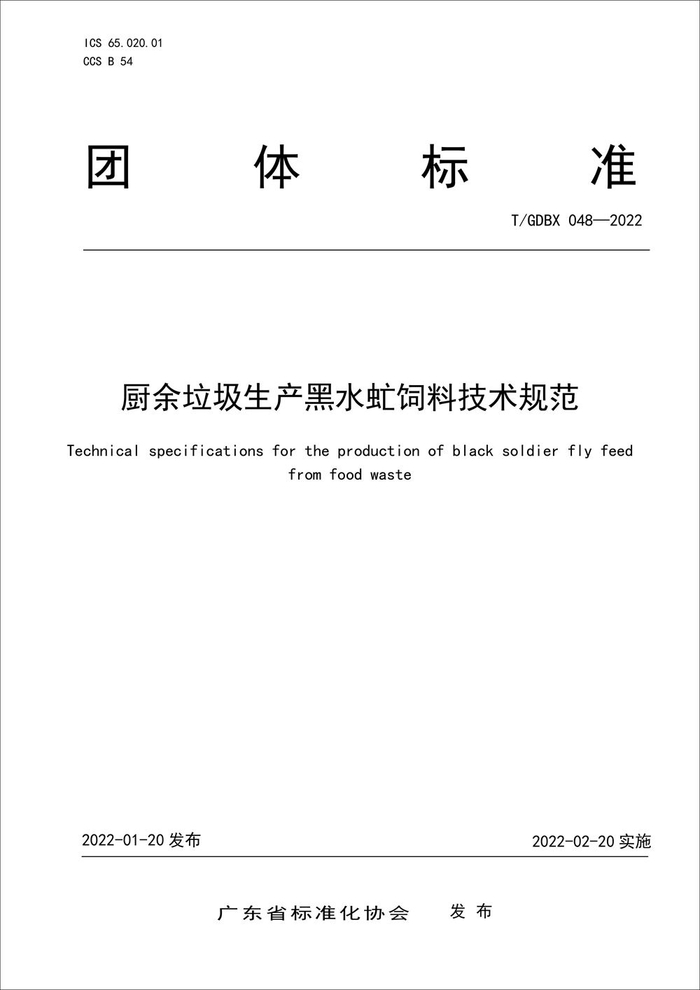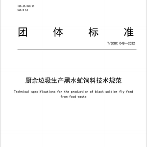 该团标规定了厨余垃圾生产黑水虻饲料的工厂化工艺流程,包括控水、除杂、除臭、添加营养剂和保鲜剂、制浆等。要求不得使用已经腐败变质的厨余垃圾和营养剂,生产过程设备加工系统稳定、无污水排出、气体排放和噪音达标。制成品要求无油脂酸败味,无蛋白质变质味。技术指标要求粗蛋白含量≥5%,粗脂肪含量≥3%,水分≤82%,粗灰分≤5%,挥发性盐基氮≤50mg/100g,无机物和难腐有机物≤3%。卫生指标参照GB 13018的规定执行。据试验测算,用这一标准饲料饲养黑水虻,饲料转化率达到20%,即5公斤饲料可产出1公斤黑水虻虫,比原始投养提高40%,取得可观的经济效益、社会效益和生态效益。