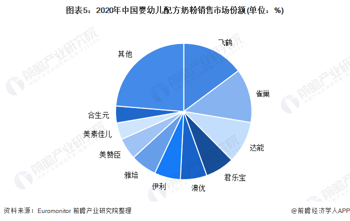 根据Euromonitor的数据,2020年中国婴幼儿配方奶粉市场CR10为76.9%,前五大品牌分别为飞鹤、惠氏、达能、君乐宝、澳优。CR10中有5个国产品牌,2020年飞鹤的市占率超越惠氏成为第一,达到14.80%,君乐宝占比为6.9%,澳优占比为6.3%。