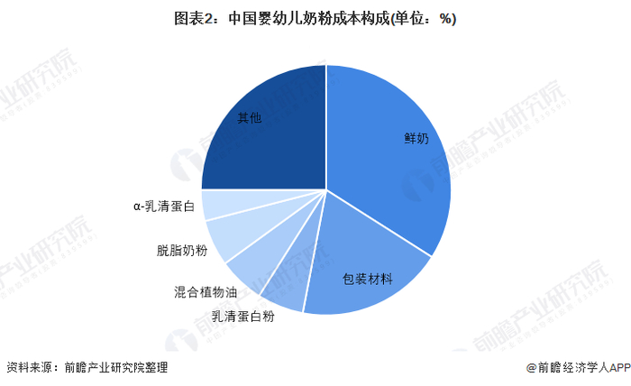 婴幼儿配方奶粉中,鲜奶是其主要原材料,约占到奶粉产品成本的34%;其次是奶粉的包装材料,构成其总成本的19%;婴幼儿奶粉的主要原材料还有乳清蛋白粉、混合植物油、脱脂奶粉、α-乳清蛋白,其分别占总成本的6%、6%、6%和4%。