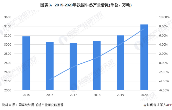 近年来,我国奶牛存栏量呈下降幅度,但牛奶产量受此影响较小。2020年,我国牛奶产量仍然实现了较大幅度的增长,产量达到3440.14万吨,较2019年增长7.46%。