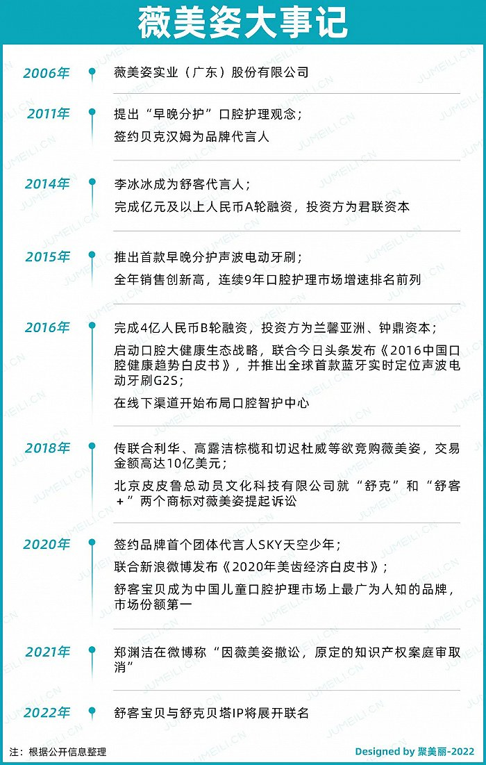 官方资料显示,薇美姿成立于2006年,是集研发、生产和销售于一体的创新型高科技企业。旗下拥有口腔护理品牌舒客(Saky)和儿童口腔护理品牌舒客宝贝(SakyKids)两大品牌。