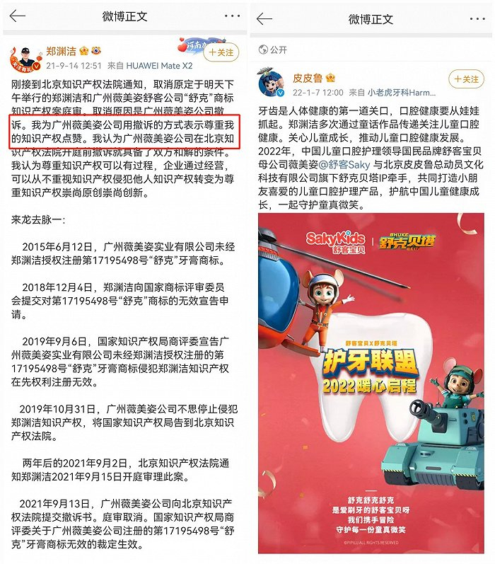 而在2018年末,北京皮皮鲁总动员文化科技有限公司还因“舒克”和“舒客+”两个商标对薇美姿提起了诉讼,双方因为这件事闹得沸沸扬扬。