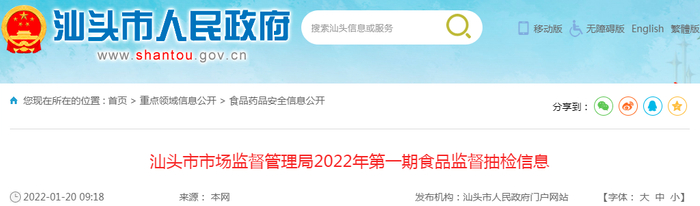 中国质量新闻网讯 2022年1月20日,广东省汕头市人民政府网站发布汕头市市场监督管理局2022年第一期食品监督抽检信息。