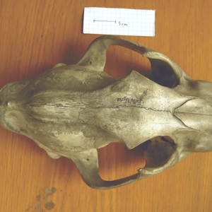 动物考古尤其关注虎的骨骼。虎全身骨骼有230—283块,一架完整的成年虎骨,一般质量在10千克左右(东北虎可达20千克)。各骨骼部位的特征比较明显,以头骨和下颌骨为例:虎的头骨略呈不规则的椭圆形,头骨的最高点位于额骨的中部,高度不小于头骨全长的50%,额骨高耸、中部显著下凹,脑颅明显向后倾斜,矢状嵴和人字嵴相接处(枕部)明显后突;下颌骨厚实,下缘平直,咬肌窝凹陷,冠状突很高,髁突宽大;上下颌共有牙齿30枚,齿式为3.1.3.1/3.1.2.1,犬齿发达强壮,呈圆锥状,齿尖稍向后弯,下颌第1臼齿呈凹形。