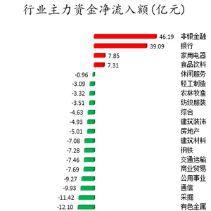 从行业板块来看,申万所属的28个一级行业,今日仅有非银金融、银行、家用电器、食品饮料4个行业板块主力资金呈现净流入,净流入金额分别为46.19亿元、39.09亿元、7.85亿元、7.31亿元。24个行业板块主力资金呈现净流出,其中,电子行业板块主力资金净流出最多,净流出金额为51.36亿元;行业板块主力资金净流出靠前的还有传媒、化工、医药生物、国防军工、电气设备、机械设备,净流出金额分别为44.36亿元、43.31亿元、40.13亿元、35.76亿元、34.47亿元、32.58亿元。