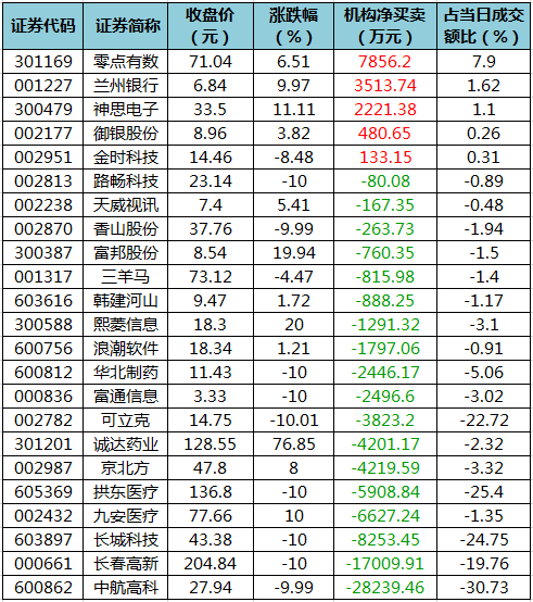 盘后龙虎榜数据显示,今日机构席位资金合计净卖出约7.51亿元。其中,净买入的个股5只,净卖出的个股18只。机构净买入最多的股票是零点有数,净买入金额约7856.2万元;机构净买入居前的还有兰州银行、神思电子等股。机构净卖出最多的股票是中航高科,净卖出金额约2.82亿元。机构净卖出靠前的还有长春高新、长城科技、九安医疗等股。