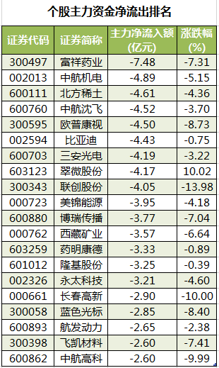 此外,3107只个股被主力资金净卖出,其中,116股被主力资金净卖出超1亿元。主力资金净流出最多的个股是富祥药业,净流出金额为7.48亿元;主力资金净流出居前的个股还有中航机电、北方稀土、中航沈飞、欧普康视、比亚迪,净流出金额分别为4.89亿元、4.61亿元、4.52亿元、4.5亿元、4.43亿元。